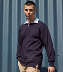 100% ringspun combed cotton single jersey. Heavyweight. Traditional woven rugby collar with cotton webbing. Taped collar and rubber buttons. Reinforced shoulder seams and side vents. Locker patch. Elastane ribbed cuffs. Twin needle hem. Tag free. For leisure use only.