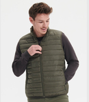 Polyester outer and lining. Polyester down padding. Showerproof. Lightweight. Collar high full length nylon zip. Elasticated bound armholes and hem. Two front zip pockets. Packs into unbranded storage bag. Unbranded size label.