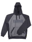 Grey marl hooded sweatshirt. Three piece hood construction with flat draw--cord. Kangeroo pocket to front. Self fabric side panels with eyelet holes for ventilation. Large Dewalt logo to front. Guaranteed tough logo to right arm. A warm garment for those colder days at work.