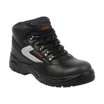 Black buffalo grain leather safety boot. Steel toe cap and steel midsole protection. Large padded collar for maximum comfort. Reflective flash to side of boot. Dual density polyurethane outsole. Anti-static. Ideal for many types of industry.